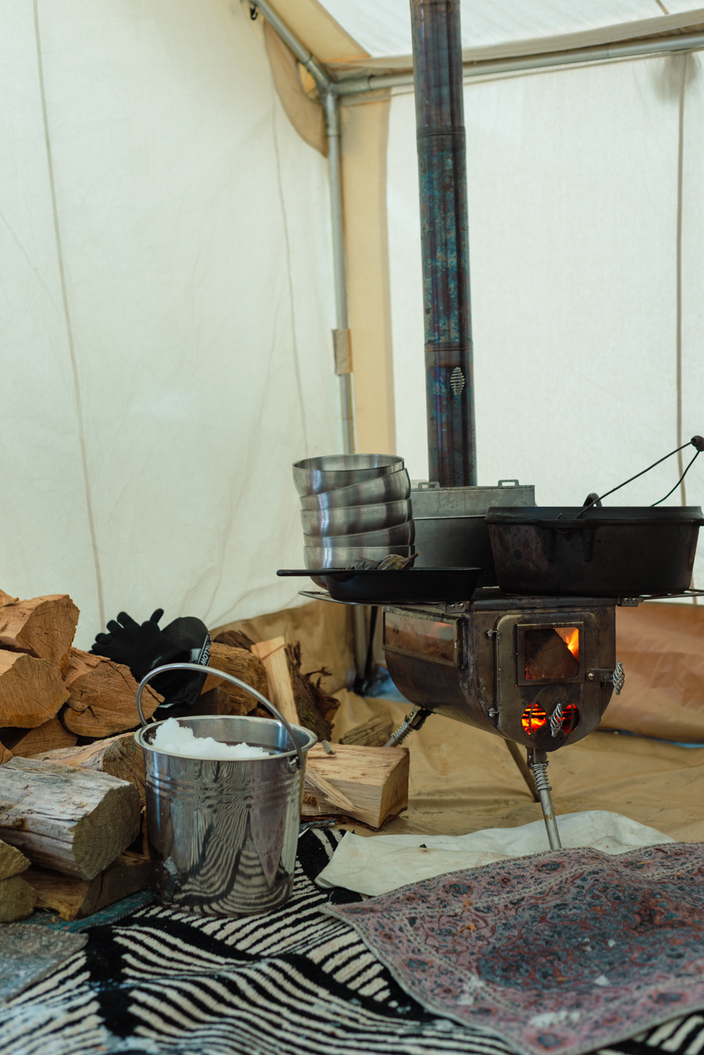 That same philosophy extends to the mountains. Dinner and breakfast at your overnight snow camp are cooked over a wood-fired stove inside the safari-style tent, 7,000 feet above sea level. On our final morning before departure, we were served pork belly with cooked dates and eggs—a hearty start engineered for the cold day ahead. Even in the backcountry, the attention to what you're eating never wavers.